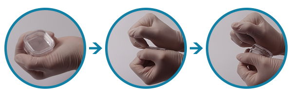 CPK-M-3816 操作方法 步骤 1: 一只手抓住盒子边缘 步骤 2: 另一只手抠住盖子边缘R角。 步骤 3: 打开盖子后将产品放入或取出。
